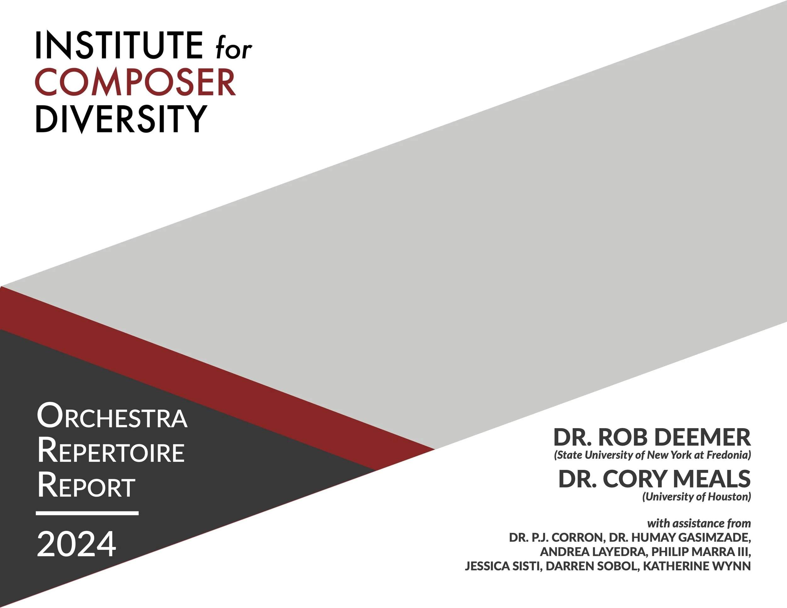 The Institute of Composer Diversity has partnered with the League of American Orchestras to produce our annual Orchestra Repertoire Report. The reports below analyze and explore the programming of U.S. Orchestras throughout each performance season. Our most recent 2024 Report covers programming by 212 Orchestras throughout the United States at all budget levels (including youth orchestras).